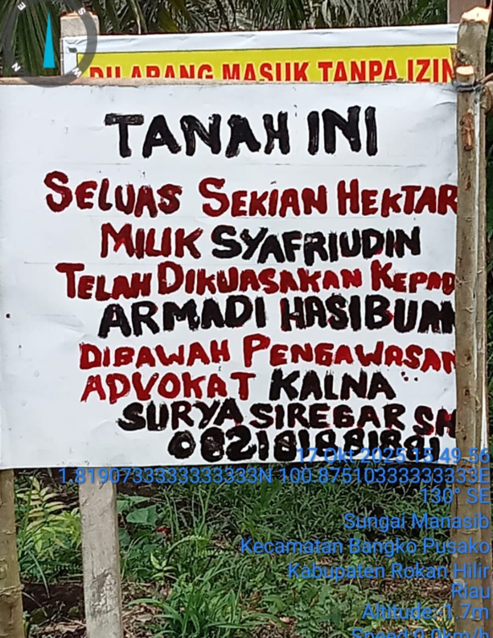 Rokan Hilir-Riau – //DJALAPAKSINEWS// — (18/10/2025), Dugaan tindakan perusakan dan atau penimbunan (tindakan penimpaan) plang kepemilikan tanah kembali terjadi di wilayah Sungai Manasib, Kecamatan Bangko Pusako, Kabupaten Rokan Hilir.